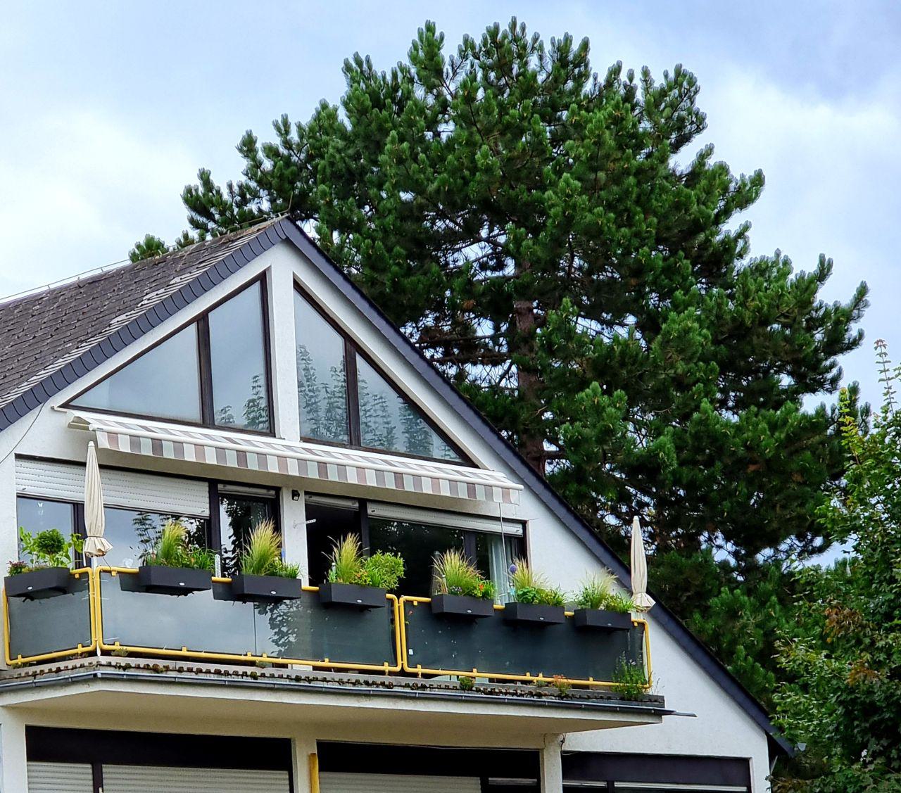 gelangen Sie auf den großzügigen Balkon. Dort wurde 2018 eine Markise (6,5 m lang)