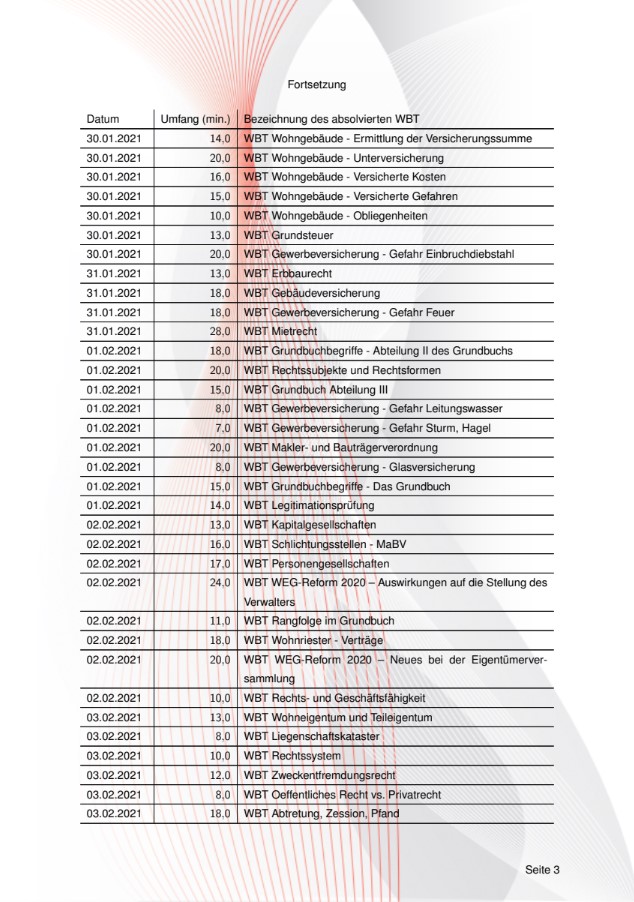Gemäß 34c Abs. 2a der Gewerberordnung (GewO), sowie § 15b der Makler- und Bauträgerverordnung (MaBV) bin ich verpflichtet, mich in einem Umfang von 20 Stunden innerhalb eines Zeitraums von drei Kalenderjahren fachlich weiterzubilden. 2018 bis 2020 und 2021 bis 2023 erfolgreich teilgenommen